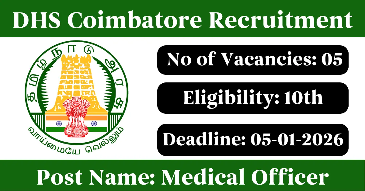 DHS Coimbatore Recruitment 2026: Apply for 5 Medical Officer, Driver vacancies. District Health Society Coimbatore invited applications from eligible and interested candidates to fill up Medical Officer, Driver Posts through DHS Coimbatore official notification December 2025. Job seekers who are looking for a career in Coimbatore – Tamil Nadu Government can make use of this opportunity. Interested candidates can Apply Offline on or before 05-Jan-2026