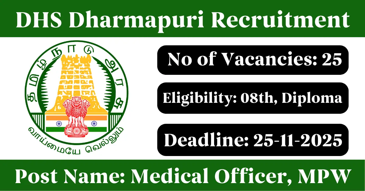 DHS Dharmapuri Recruitment 2025: Apply for 25 Medical Officer, MPW vacancies. District Health Society Dharmapuri invited applications from eligible and interested candidates to fill up Medical Officer, MPW Posts through DHS Dharmapuri official notification November 2025. Job seekers who are looking for a career in Dharmapuri – Tamil Nadu Government can make use of this opportunity. Interested candidates can Apply Offline on or before 25-Nov-2025