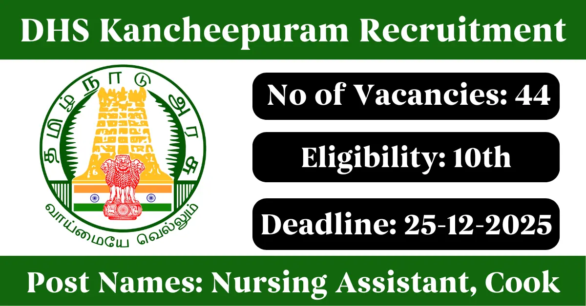 DHS Kancheepuram Recruitment 2025: Apply for 44 Nursing Assistant, Cook vacancies. District Health Society Kancheepuram invited applications from eligible and interested candidates to fill up Nursing Assistant, Cook Posts through DHS Kancheepuram official notification December 2025. Job seekers who are looking for a career in Kancheepuram – Tamil Nadu Government can make use of this opportunity. Interested candidates can Apply Offline on or before 25-Dec-2025