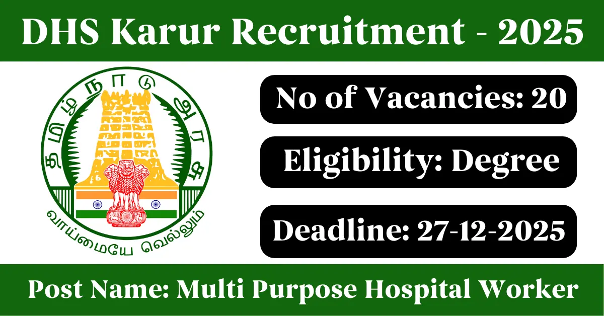 DHS Karur Recruitment 2025: Apply for 20 Multi Purpose Hospital Worker vacancies. District Health Society Karur invited applications from eligible and interested candidates to fill up Multi Purpose Hospital Worker Posts through DHS Karur official notification December 2025. Job seekers who are looking for a career in Karur – Tamil Nadu Government can make use of this opportunity. Interested candidates can Apply Offline on or before 27-Dec-2025