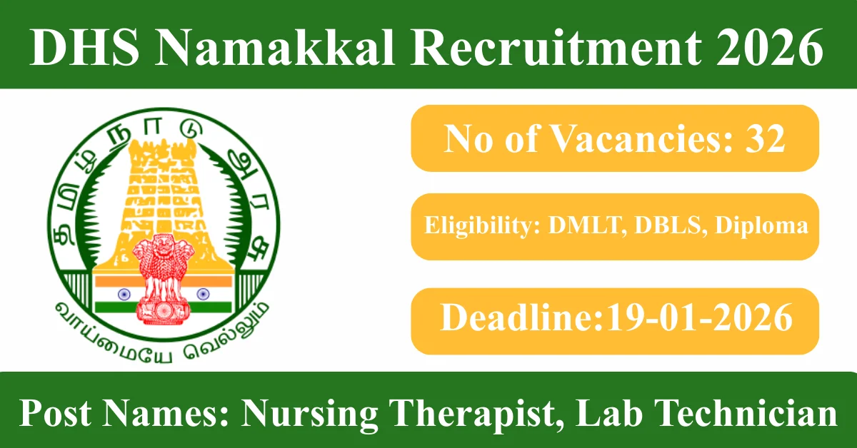 DHS Namakkal Recruitment 2026: Apply for 32 Nursing Therapist, Lab Technician vacancies. District Health Society Namakkal invited applications from eligible and interested candidates to fill up Nursing Therapist, Lab Technician Posts through DHS Namakkal official notification January 2026. Job seekers who are looking for a career in Namakkal – Tamil Nadu Government can make use of this opportunity. Interested candidates can Apply Offline on or before 19-Jan-2026