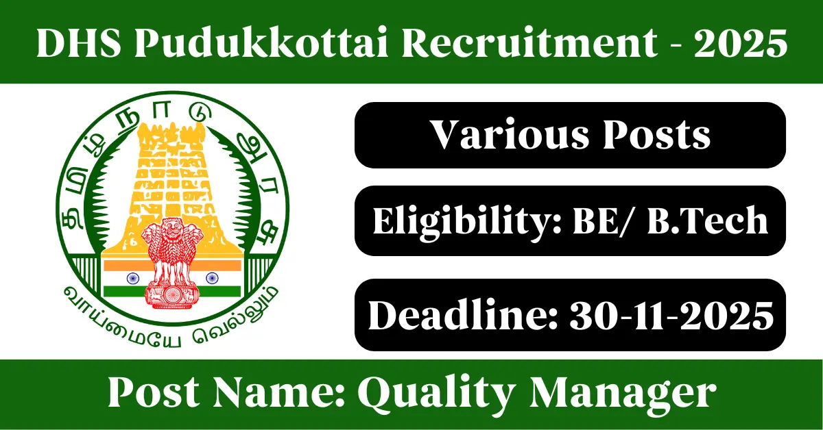 DHS Pudukkottai Recruitment 2025: Apply for Various Quality Manager vacancies. District Health Society Pudukkottai invited applications from eligible and interested candidates to fill up Quality Manager Posts through DHS Pudukkottai official notification November 2025. Job seekers who are looking for a career in Pudukkottai – Tamil Nadu Government can make use of this opportunity. Interested candidates can Apply Offline on or before 30-Nov-2025