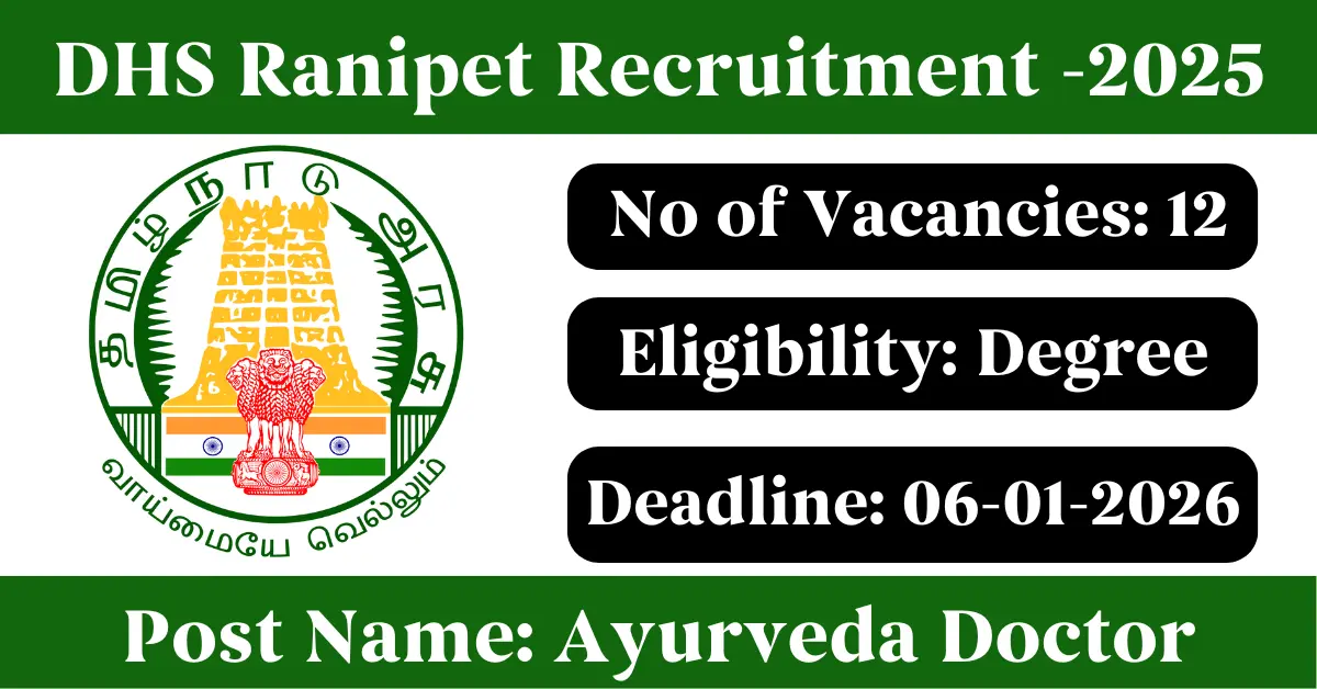 DHS Ranipet Recruitment 2025: Apply for 12 Ayurveda Doctor, Staff Nurse vacancies. District Health Society Ranipet invited applications from eligible and interested candidates to fill up Ayurveda Doctor, Staff Nurse Posts through DHS Ranipet official notification December 2025. Job seekers who are looking for a career in Ranipet – Tamil Nadu Government can make use of this opportunity. Interested candidates can Apply Offline on or before 06-Jan-2026
