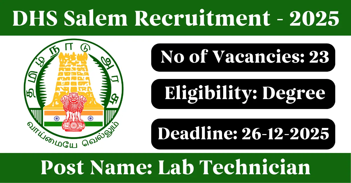DHS Salem Recruitment 2025: Apply for 23 Lab Technician vacancies. District Health Society Salem invited applications from eligible and interested candidates to fill up Lab Technician Posts through DHS Salem official notification December 2025. Job seekers who are looking for a career in Salem – Tamil Nadu Government can make use of this opportunity. Interested candidates can Apply Offline on or before 26-Dec-2025