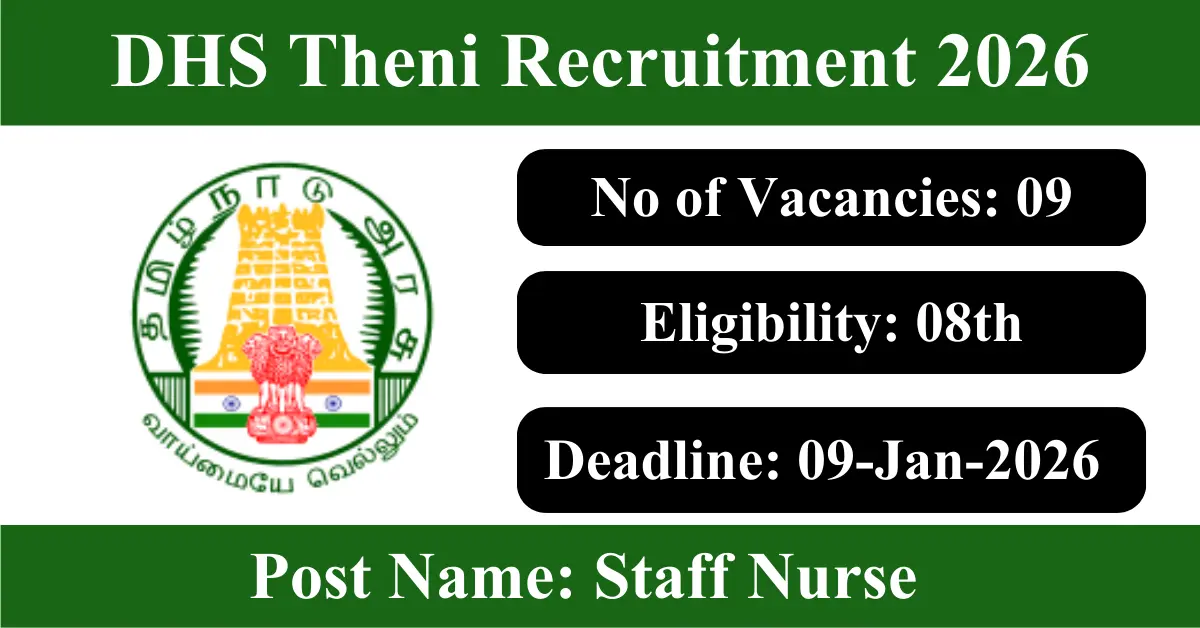 DHS Theni Recruitment 2026: Apply for 9 Staff Nurse vacancies. District Health Society Theni invited applications from eligible and interested candidates to fill up Staff Nurse Posts through DHS Theni official notification December 2025. Job seekers who are looking for a career in Theni – Tamil Nadu Government can make use of this opportunity. Interested candidates can Apply Offline on or before 09-Jan-2026