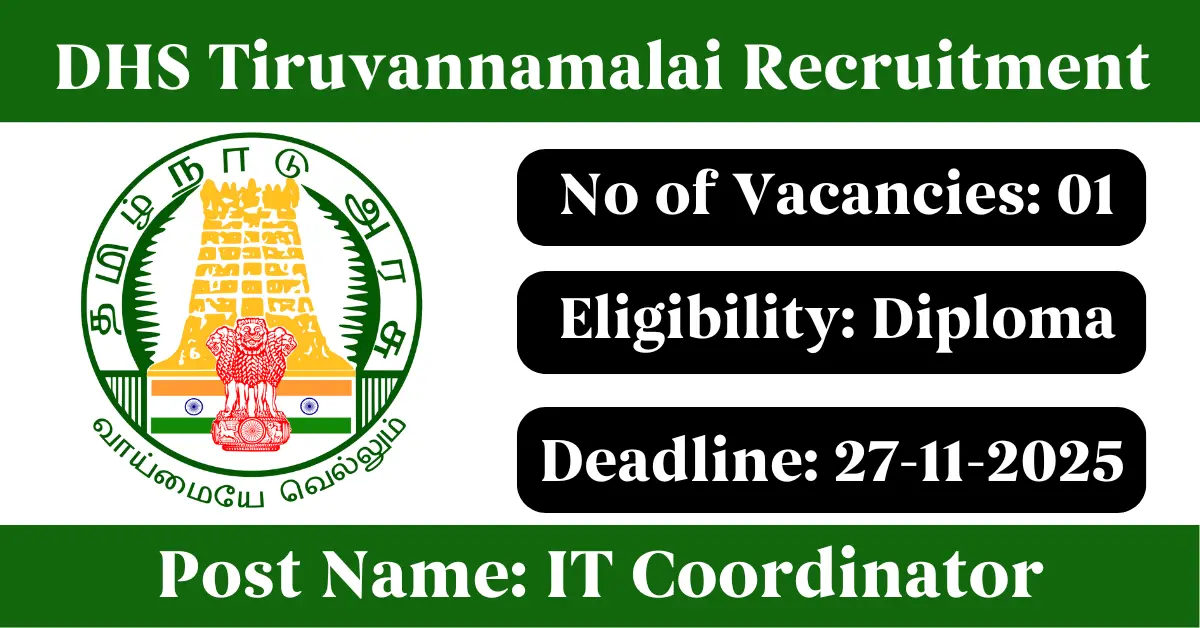 DHS Tiruvannamalai Recruitment 2025: Apply for 1 IT Coordinator vacancies. District Health Society Tiruvannamalai invited applications from eligible and interested candidates to fill up IT Coordinator Posts through DHS Tiruvannamalai official notification November 2025. Job seekers who are looking for a career in Tiruvannamalai – Tamil Nadu Government can make use of this opportunity. Interested candidates can Apply Offline on or before 27-Nov-2025