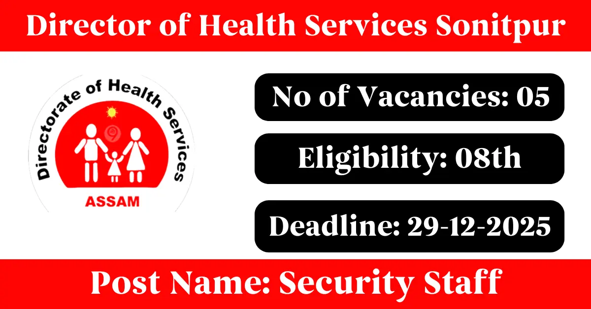 Director of Health Services Sonitpur Recruitment 2025: Apply for 5 Security Staff vacancies. Director of Health Services Sonitpur invited applications from eligible and interested candidates to fill up Security Staff Posts through Director of Health Services Sonitpur official notification December 2025. Job seekers who are looking for a career in Sonitpur – Assam Government can make use of this opportunity. Interested candidates can attend for Walk-in-interview on 29-Dec-2025