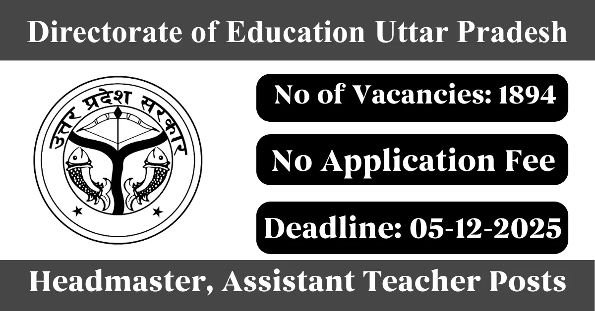Directorate of Education Uttar Pradesh Recruitment 2025: Apply for 1894 Headmaster, Assistant Teacher vacancies. Directorate of Education Uttar Pradesh invited applications from eligible and interested candidates to fill up Headmaster, Assistant Teacher Posts through Directorate of Education Uttar Pradesh official notification November 2025. Job seekers who are looking for a career in Uttar Pradesh Government can make use of this opportunity. Interested candidates can Apply Online on or before 05-Dec-2025