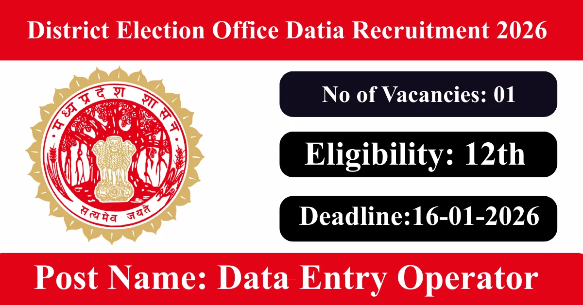 District Election Office Datia Recruitment 2026: Apply for 1 Data Entry Operator vacancies. District Election Office Datia invited applications from eligible and interested candidates to fill up Data Entry Operator Posts through District Election Office Datia official notification January 2026. Job seekers who are looking for a career in Datia – Madhya Pradesh Government can make use of this opportunity. Interested candidates can Apply Offline on or before 16-Jan-2026