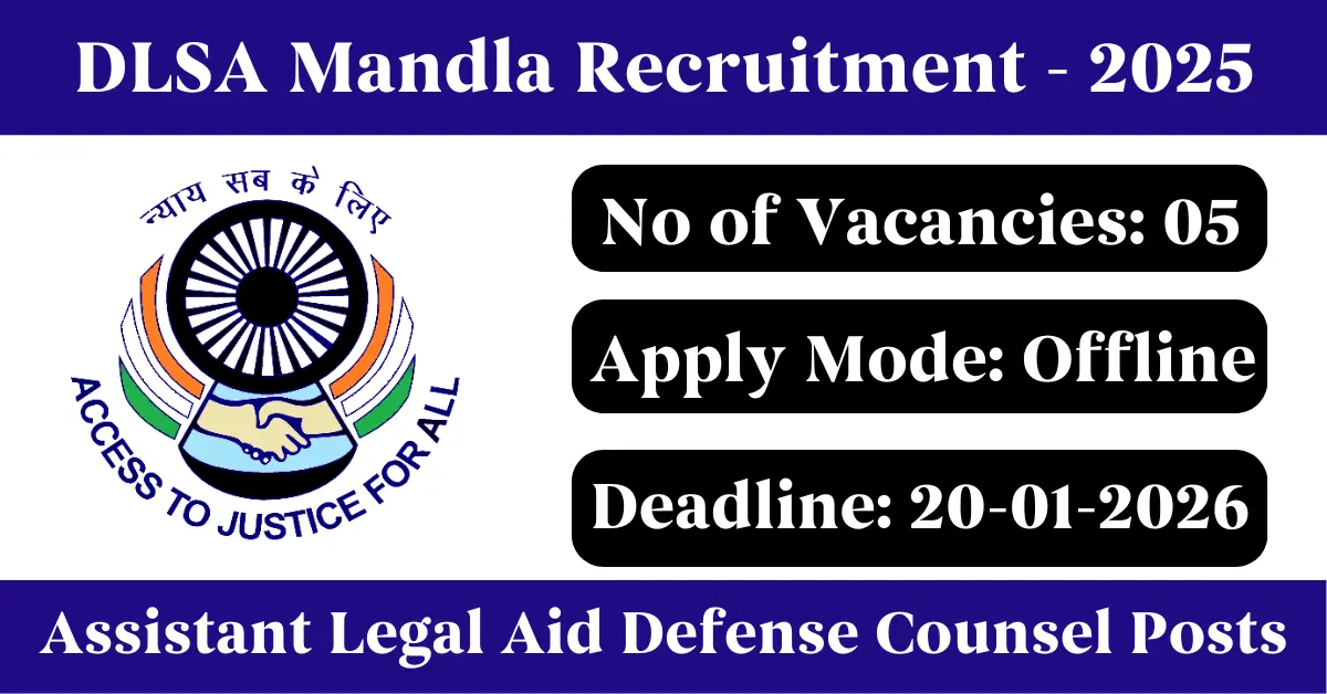 DLSA Mandla Recruitment 2025: Apply for 5 Assistant Legal Aid Defense Counsel vacancies. District Legal Services Authority Mandla invited applications from eligible and interested candidates to fill up Assistant Legal Aid Defense Counsel Posts through DLSA Mandla official notification December 2025. Job seekers who are looking for a career in Mandla – Madhya Pradesh Government can make use of this opportunity. Interested candidates can Apply Offline on or before 20-Jan-2026
