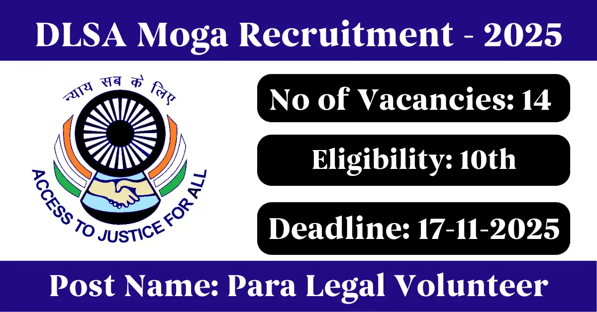 DLSA Moga Recruitment 2025: Apply for 14 Para Legal Volunteer vacancies. District Legal Services Authority Moga invited applications from eligible and interested candidates to fill up Para Legal Volunteer Posts through DLSA Moga official notification November 2025. Job seekers who are looking for a career in Moga – Punjab Government can make use of this opportunity. Interested candidates can Apply Offline on or before 17-Nov-2025