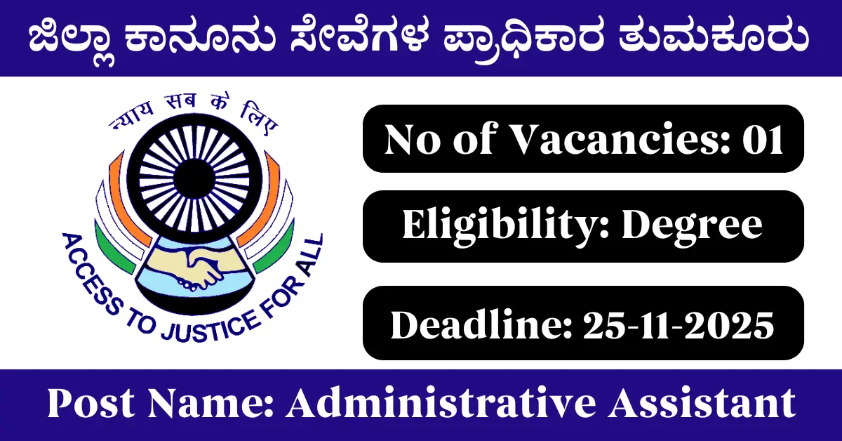 DLSA Tumkur Recruitment 2025: Apply for 01 Administrative Assistant vacancy. District Legal Services Authority Tumkur invited applications from eligible and interested candidates to fill up Administrative Assistant Posts through DLSA Tumkur official notification November 2025. Job seekers who are looking for a career in Tumkur – Karnataka Government can make use of this opportunity. Interested candidates can Apply Offline on or before 25-Nov-2025.