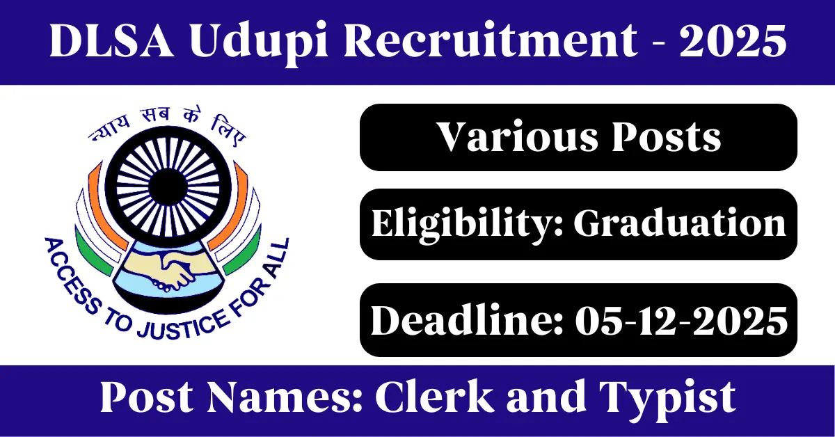 DLSA Udupi Recruitment 2025: Apply for Various Administrative Assistance/ Clerk and Typist vacancies. District Legal Services Authority Udupi invited applications from eligible and interested candidates to fill up Administrative Assistance/ Clerk and Typist Posts through DLSA Udupi official notification November 2025. Job seekers who are looking for a career in Udupi – Karnataka Government can make use of this opportunity. Interested candidates can Apply Offline on or before 05-Dec-2025