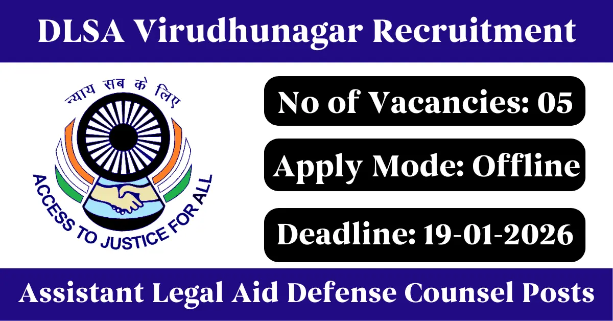 DLSA Virudhunagar Recruitment 2025: Apply for 5 Assistant Legal Aid Defense Counsel vacancies. District Legal Services Authority Virudhunagar invited applications from eligible and interested candidates to fill up Assistant Legal Aid Defense Counsel Posts through DLSA Virudhunagar official notification December 2025. Job seekers who are looking for a career in Virudhunagar – Tamil Nadu Government can make use of this opportunity. Interested candidates can Apply Offline on or before 19-Jan-2026