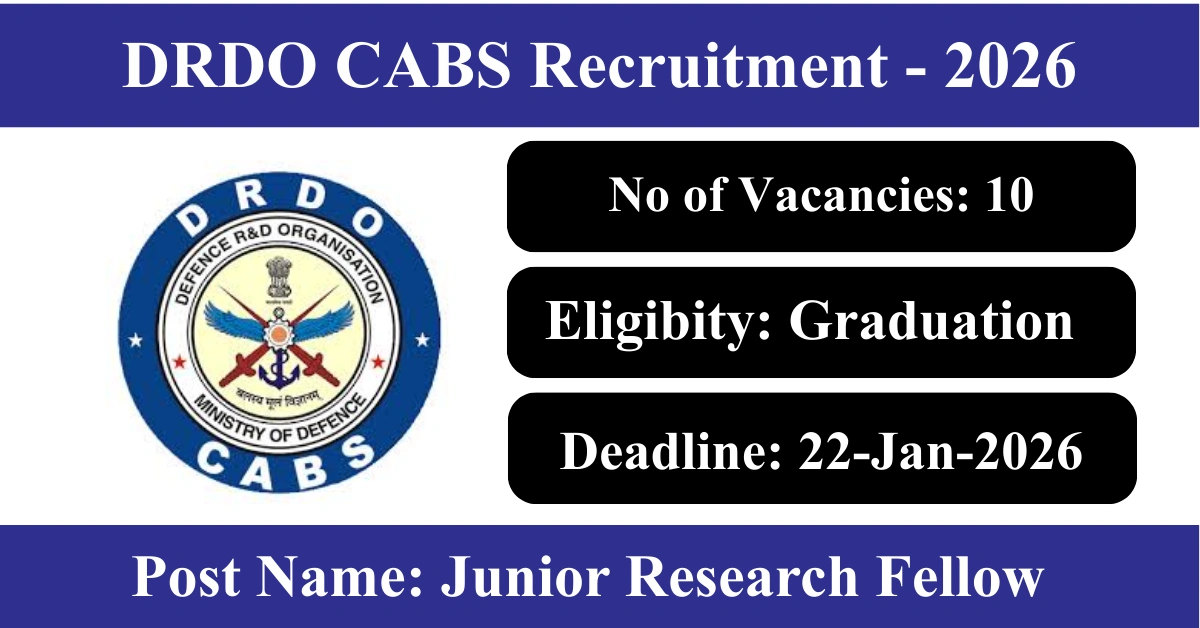 DRDO CABS Recruitment 2026: Apply for 10 Junior Research Fellow vacancies. Centre for Air Borne Systems invited applications from eligible and interested candidates to fill up Junior Research Fellow Posts through DRDO CABS official notification January 2026. Job seekers who are looking for a career in Bengaluru – Karnataka Government can make use of this opportunity. Interested candidates can send an E-Mail on or before 22-Jan-2026