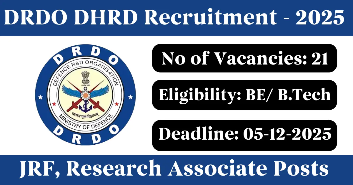 DRDO DHRD Recruitment 2025: Apply for 21 JRF, Research Associate vacancies. DRDO Directorate of Human Resource Development invited applications from eligible and interested candidates to fill up JRF, Research Associate Posts through DRDO DHRD official notification November 2025. Job seekers who are looking for a career in Chandigarh Government can make use of this opportunity. Interested candidates can attend for Walk-in-interview on 05-Dec-2025