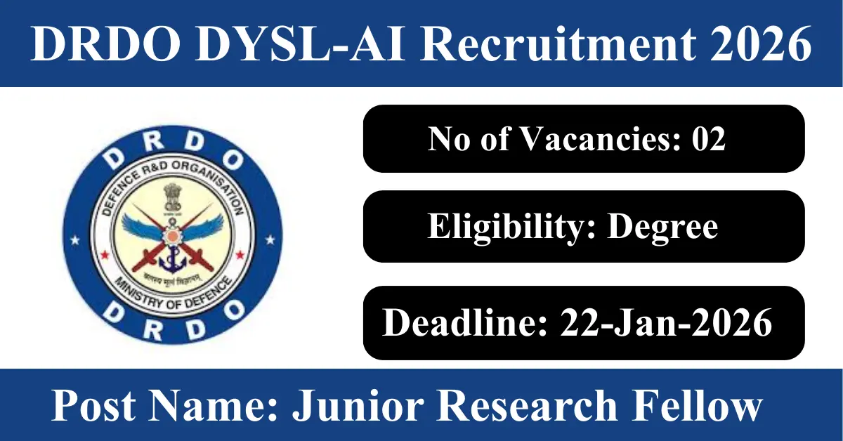 DRDO DYSL-AI Recruitment 2026: Apply for 2 Junior Research Fellow vacancies. DRDO Young Scientist Laboratory-Artificial Intelligence invited applications from eligible and interested candidates to fill up Junior Research Fellow Posts through DRDO DYSL-AI official notification January 2026. Job seekers who are looking for a career in Bangalore – Karnataka Government can make use of this opportunity. Interested candidates can Apply Offline on or before 22-Jan-2026