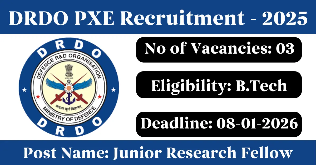 DRDO PXE Recruitment 2025: Apply for 3 Junior Research Fellow vacancies. DRDO Proof & Experimental Establishment invited applications from eligible and interested candidates to fill up Junior Research Fellow Posts through DRDO PXE official notification December 2025. Job seekers who are looking for a career in Balasore – Odisha Government can make use of this opportunity. Interested candidates can send an E-Mail on or before 08-Jan-2026