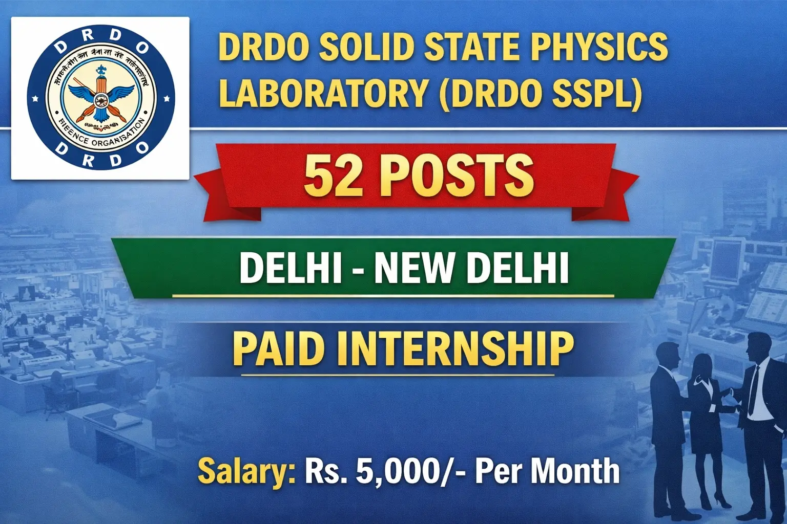 DRDO SSPL Recruitment 2026: Apply for 52 Paid Internship vacancies. DRDO Solid State Physics Laboratory invited applications from eligible and interested candidates to fill up Paid Internship Posts through DRDO SSPL official notification December 2025. Job seekers who are looking for a career in Delhi – New Delhi Government can make use of this opportunity. Interested candidates can Apply Online on or before 14-Jan-2026
