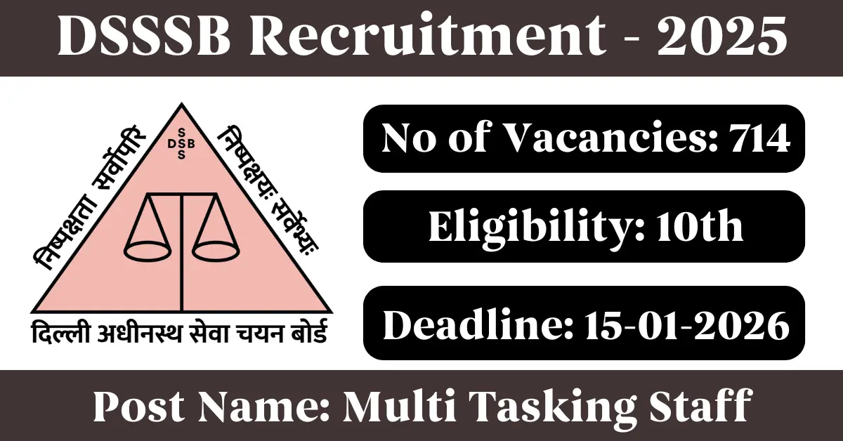 DSSSB Recruitment 2025: Apply for 714 Multi Tasking Staff (MTS) vacancies. Delhi Subordinate Service Selection Board invited applications from eligible and interested candidates to fill up Multi Tasking Staff (MTS) Posts through DSSSB official notification December 2025. Job seekers who are looking for a career in Delhi – New Delhi Government can make use of this opportunity. Interested candidates can Apply Online on or before 15-Jan-2026
