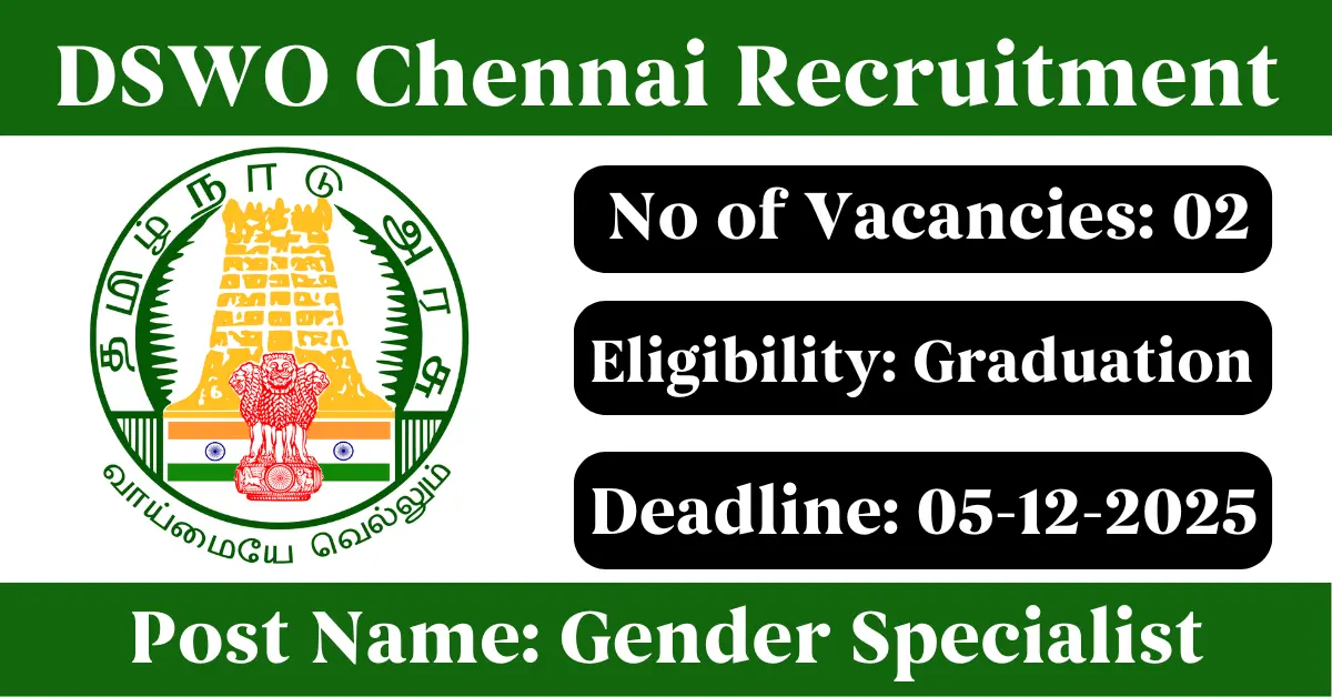 DSWO Chennai Recruitment 2025: Apply for 2 Gender Specialist vacancies. District Social Welfare Office Chennai invited applications from eligible and interested candidates to fill up Gender Specialist Posts through DSWO Chennai official notification November 2025. Job seekers who are looking for a career in Chennai – Tamil Nadu Government can make use of this opportunity. Interested candidates can Apply Offline on or before 05-Dec-2025
