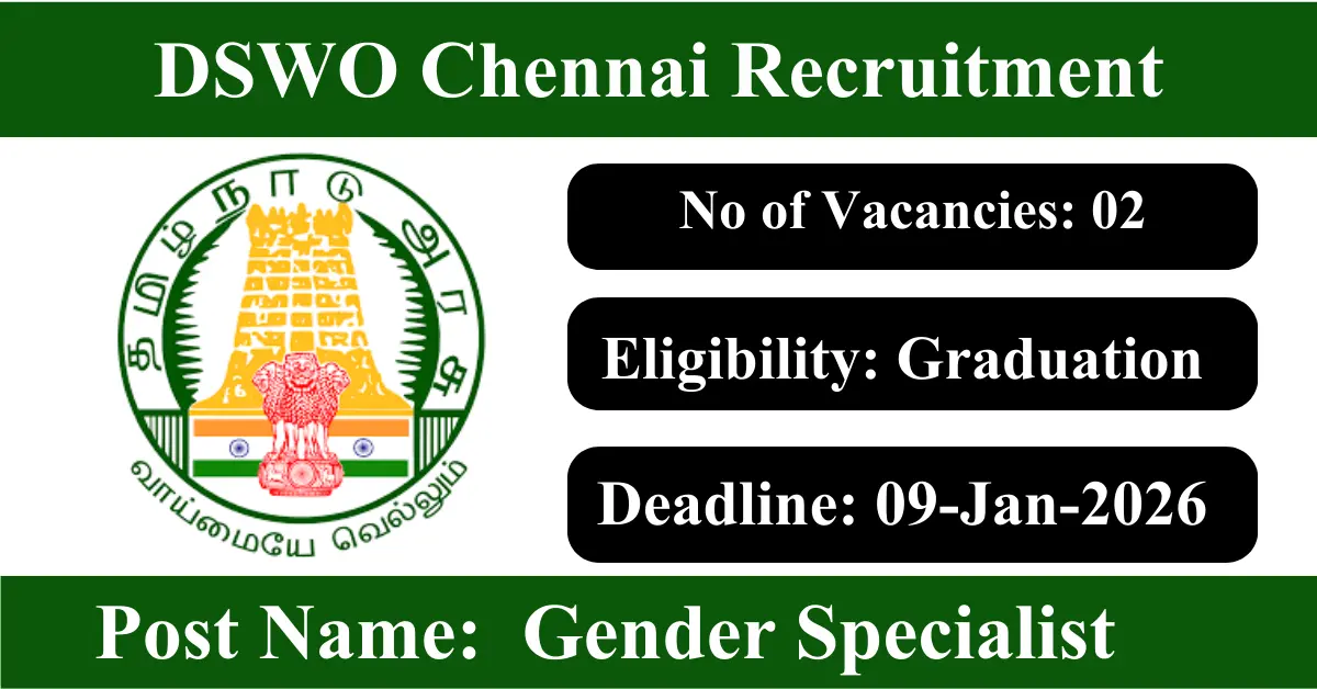 DSWO Chennai Recruitment 2026: Apply for 2 Gender Specialist vacancies. District Social Welfare Office Chennai invited applications from eligible and interested candidates to fill up Gender Specialist Posts through DSWO Chennai official notification December 2025. Job seekers who are looking for a career in Chennai – Tamil Nadu Government can make use of this opportunity. Interested candidates can Apply Offline on or before 09-Jan-2026