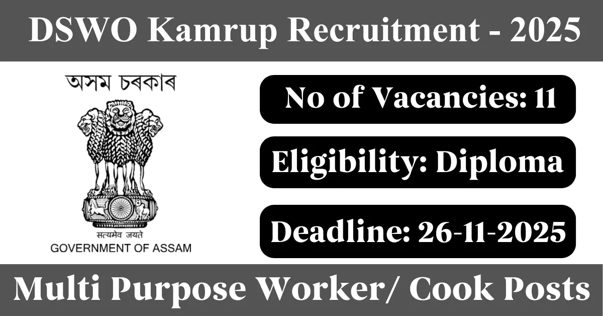 DSWO Kamrup Recruitment 2025: Apply for 11 Multi Purpose Worker/ Cook vacancies. District Social Welfare Office Kamrup invited applications from eligible and interested candidates to fill up Multi Purpose Worker/ Cook Posts through DSWO Kamrup official notification November 2025. Job seekers who are looking for a career in Kamrup – Assam Government can make use of this opportunity. Interested candidates can Apply Offline on or before 26-Nov-2025