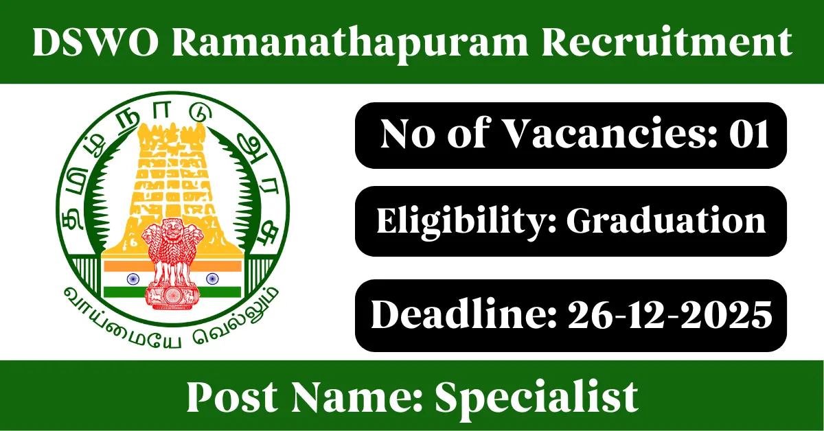 DSWO Ramanathapuram Recruitment 2025: Apply for 1 Specialist in Financial Literacy vacancies. District Social Welfare Office Ramanathapuram invited applications from eligible and interested candidates to fill up Specialist in Financial Literacy Posts through DSWO Ramanathapuram official notification December 2025. Job seekers who are looking for a career in Ramanathapuram – Tamil Nadu Government can make use of this opportunity. Interested candidates can Apply Offline on or before 26-Dec-2025