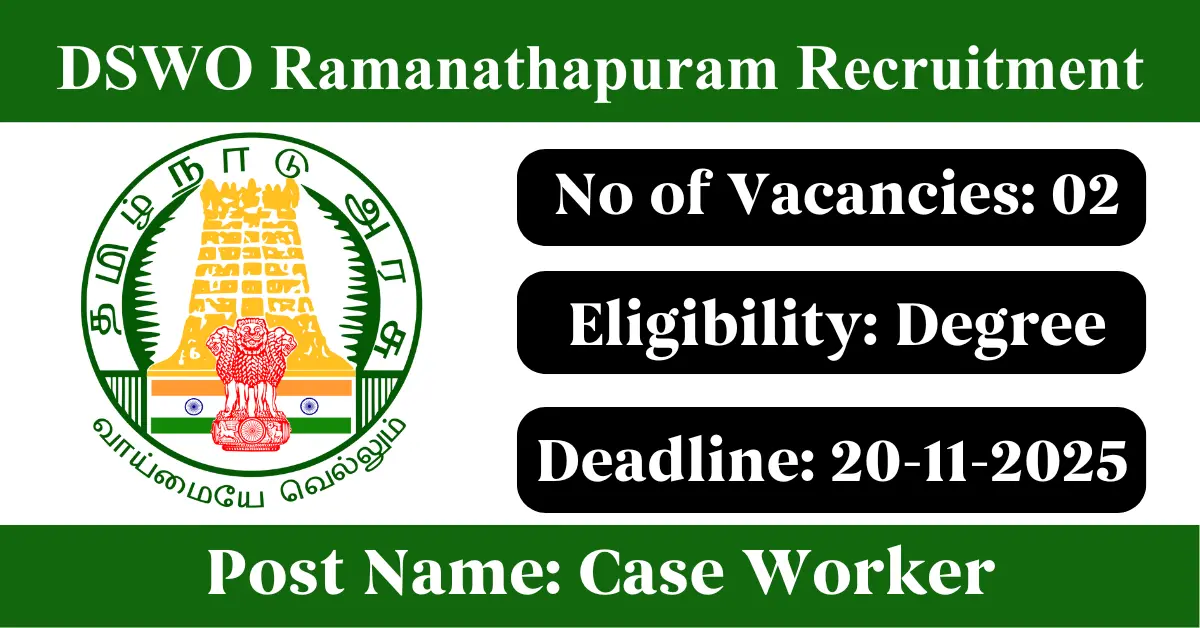DSWO Ramanathapuram Recruitment 2025: Apply for 2 Case Worker vacancies. District Social Welfare Office Ramanathapuram invited applications from eligible and interested candidates to fill up Case Worker Posts through DSWO Ramanathapuram official notification November 2025. Job seekers who are looking for a career in Ramanathapuram – Tamil Nadu Government can make use of this opportunity. Interested candidates can Apply Offline on or before 20-Nov-2025