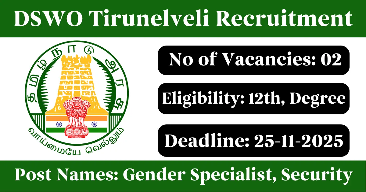 DSWO Tirunelveli Recruitment 2025: Apply for 2 Gender Specialist, Security vacancies. District Social Welfare Office Tirunelveli invited applications from eligible and interested candidates to fill up Gender Specialist, Security Posts through DSWO Tirunelveli official notification November 2025. Job seekers who are looking for a career in Tirunelveli – Tamil Nadu Government can make use of this opportunity. Interested candidates can Apply Offline on or before 25-Nov-2025