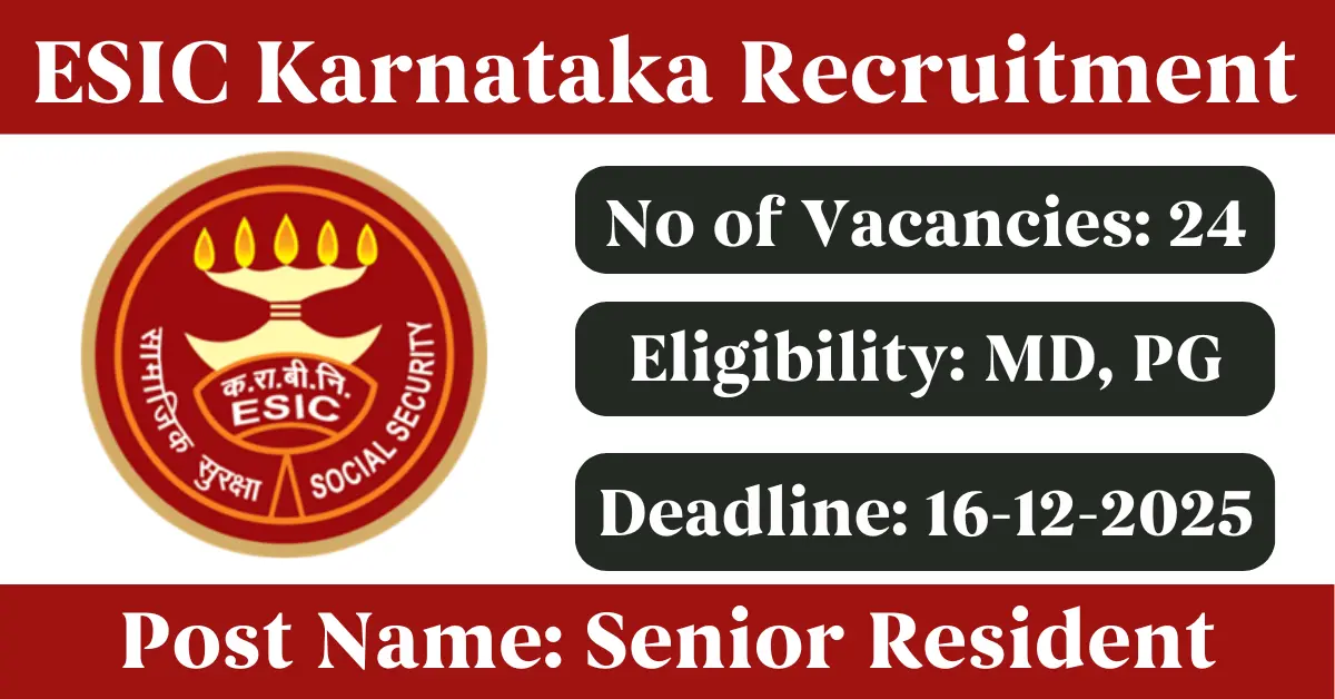 ESIC Karnataka Recruitment 2025: Apply for 24 Senior Resident vacancies. Employees State Insurance Corporation Karnataka invited applications from eligible and interested candidates to fill up Senior Resident Posts through ESIC Karnataka official notification December 2025. Job seekers who are looking for a career in Bengaluru – Karnataka Government can make use of this opportunity. Interested candidates can attend for Walk-in-interview on 16-Dec-2025