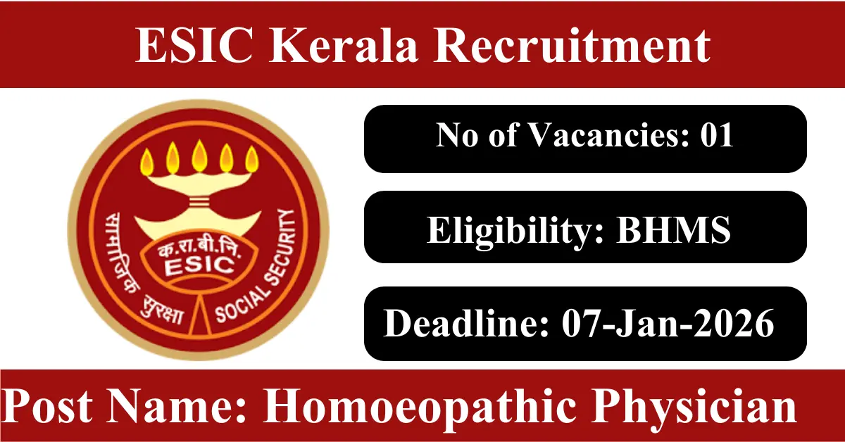 ESIC Kerala Recruitment 2026: Apply for 1 Homoeopathic Physician vacancies. Employees’ State Insurance Corporation Kerala invited applications from eligible and interested candidates to fill up Homoeopathic Physician Posts through ESIC Kerala official notification December 2025. Job seekers who are looking for a career in Kollam – Kerala Government can make use of this opportunity. Interested candidates can send an E-Mail on or before 07-Jan-2026