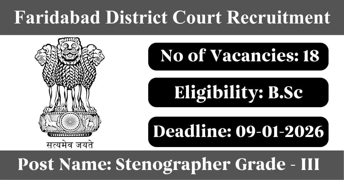 Faridabad District Court Recruitment 2025: Apply for 18 Stenographer Grade III vacancies. Faridabad eCourt invited applications from eligible and interested candidates to fill up Stenographer Grade III Posts through Faridabad District Court official notification December 2025. Job seekers who are looking for a career in Faridabad – Haryana Government can make use of this opportunity. Interested candidates can Apply Offline on or before 09-Jan-2026