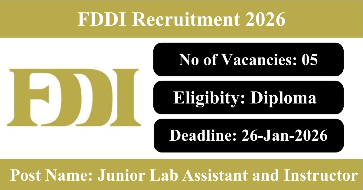FDDI Recruitment 2026: Apply for 5 Junior Lab Assistant and Instructor vacancies. Footwear Design & Development Institute invited applications from eligible and interested candidates to fill up Junior Lab Assistant and Instructor Posts through FDDI official notification January 2026. Job seekers who are looking for a career in Hyderabad – Telangana Government can make use of this opportunity. Interested candidates can Apply Online on or before 26-Jan-2026