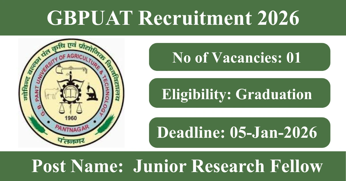 GBPUAT Recruitment 2026: Apply for 1 Junior Research Fellow vacancies. Gobind Ballabh Pant University of Agriculture and Technology invited applications from eligible and interested candidates to fill up Junior Research Fellow Posts through GBPUAT official notification January 2026. Job seekers who are looking for a career in Pantnagar – Uttarakhand Government can make use of this opportunity. Interested candidates can Apply Offline on or before 05-Jan-2026