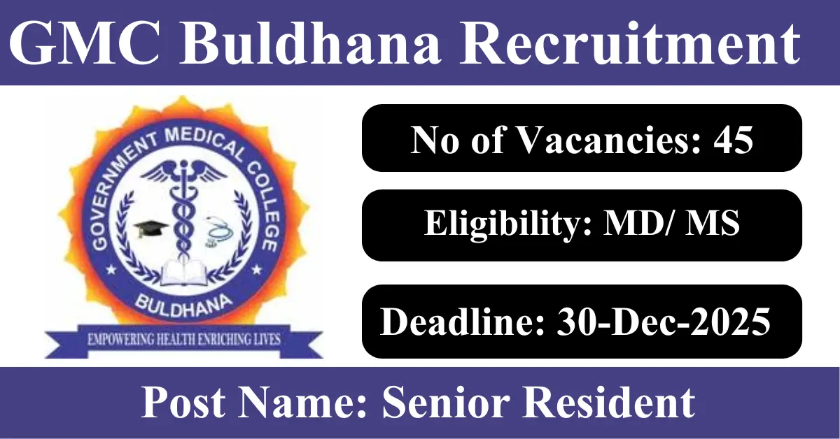 GMC Buldhana Recruitment 2026: Apply for 45 Senior Resident vacancies. Government Medical College Buldhana invited applications from eligible and interested candidates to fill up Senior Resident Posts through GMC Buldhana official notification December 2025. Job seekers who are looking for a career in Buldhana – Maharashtra Government can make use of this opportunity. Interested candidates can Apply Offline on or before 30-Dec-2025