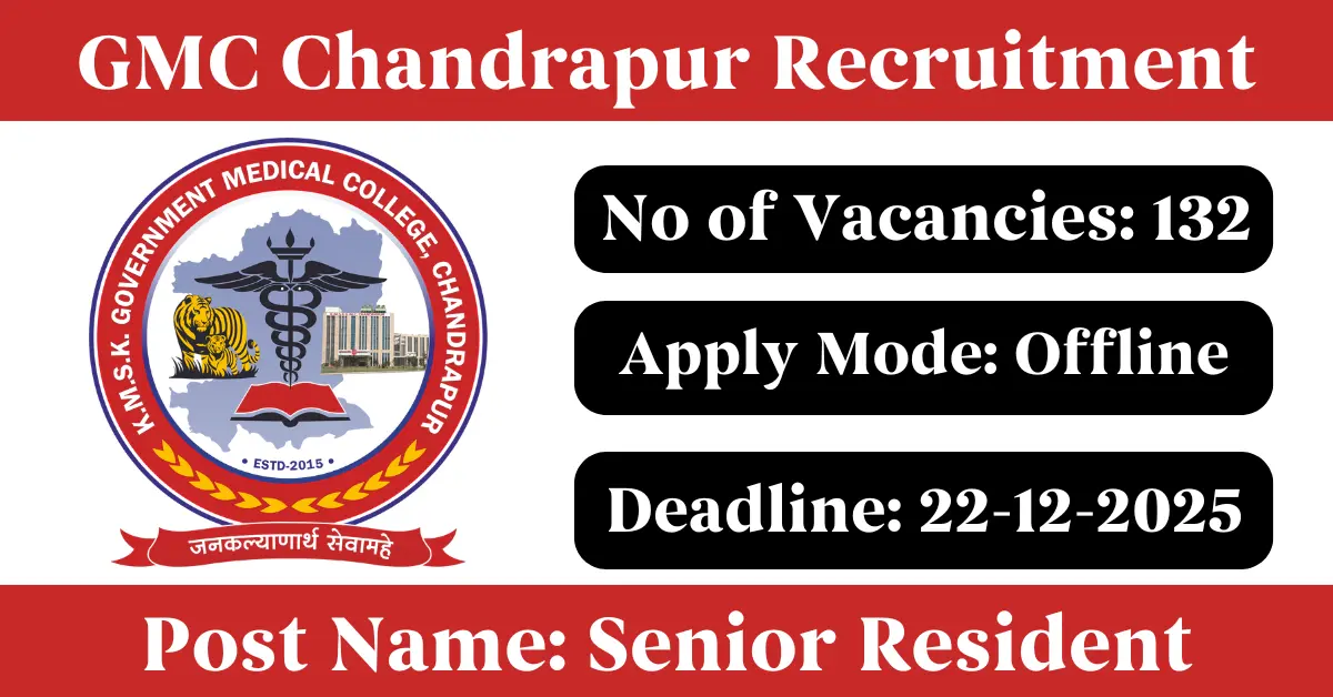 GMC Chandrapur Recruitment 2025: Apply for 132 Junior & Senior Resident vacancies. Government Medical College Chandrapur invited applications from eligible and interested candidates to fill up Junior & Senior Resident Posts through GMC Chandrapur official notification December 2025. Job seekers who are looking for a career in Chandrapur – Maharashtra Government can make use of this opportunity. Interested candidates can Apply Offline on or before 22-Dec-2025