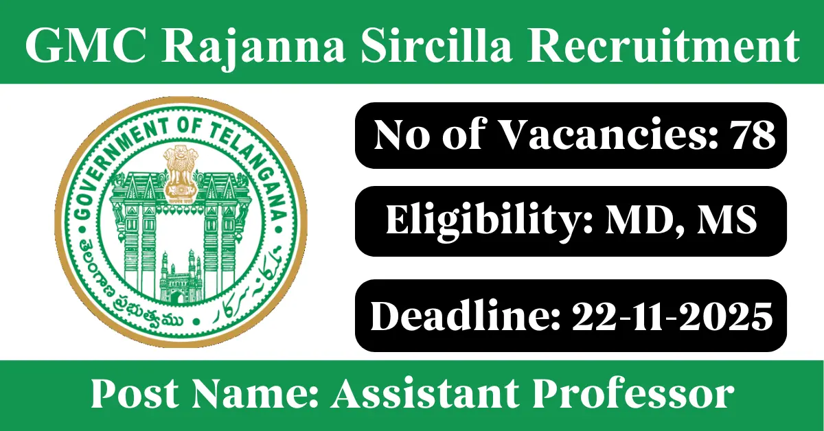 GMC Rajanna Sircilla Recruitment 2025: Apply for 78 Professor, Senior Resident vacancies. Government Medical College Rajanna Sircilla invited applications from eligible and interested candidates to fill up Professor, Senior Resident Posts through GMC Rajanna Sircilla official notification November 2025. Job seekers who are looking for a career in Rajanna Sircilla – Telangana Government can make use of this opportunity. Interested candidates can Apply Offline on or before 22-Nov-2025