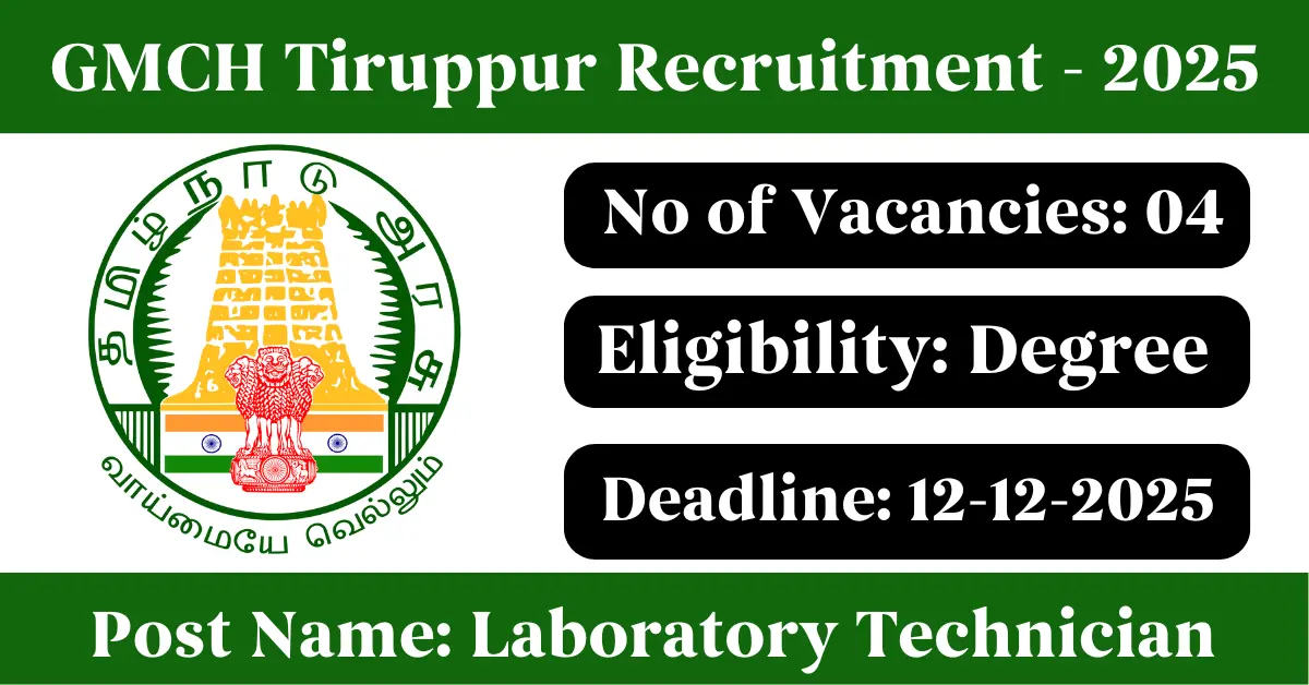 GMCH Tiruppur Recruitment 2025: Apply for 4 Laboratory Technician vacancies. Government Medical College Hospital Tiruppur invited applications from eligible and interested candidates to fill up Laboratory Technician Posts through GMCH Tiruppur official notification December 2025. Job seekers who are looking for a career in Tiruppur – Tamil Nadu Government can make use of this opportunity. Interested candidates can Apply Offline on or before 12-Dec-2025