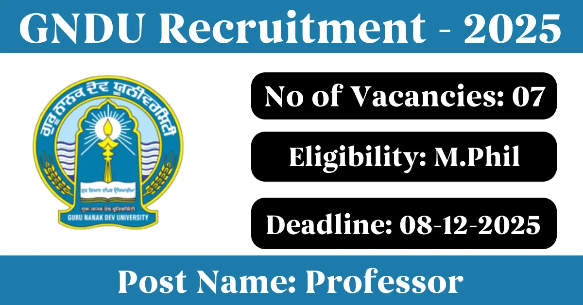 GNDU Recruitment 2025: Apply for 7 Professor vacancies. Guru Nanak Dev University invited applications from eligible and interested candidates to fill up Professor Posts through GNDU official notification November 2025. Job seekers who are looking for a career in Amritsar – Punjab Government can make use of this opportunity. Interested candidates can Apply Online/Offline on or before 08-Dec-2025