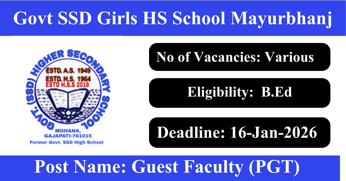 Govt SSD Girls HS School Mayurbhanj Recruitment 2026: Apply for Various Guest Faculty (PGT) vacancies. Govt SSD Girls Higher Secondary School Mayurbhanj invited applications from eligible and interested candidates to fill up Guest Faculty (PGT) Posts through Govt SSD Girls HS School Mayurbhanj official notification January 2026. Job seekers who are looking for a career in Mayurbhanj – Odisha Government can make use of this opportunity. Interested candidates can Apply Offline on or before 16-Jan-2026