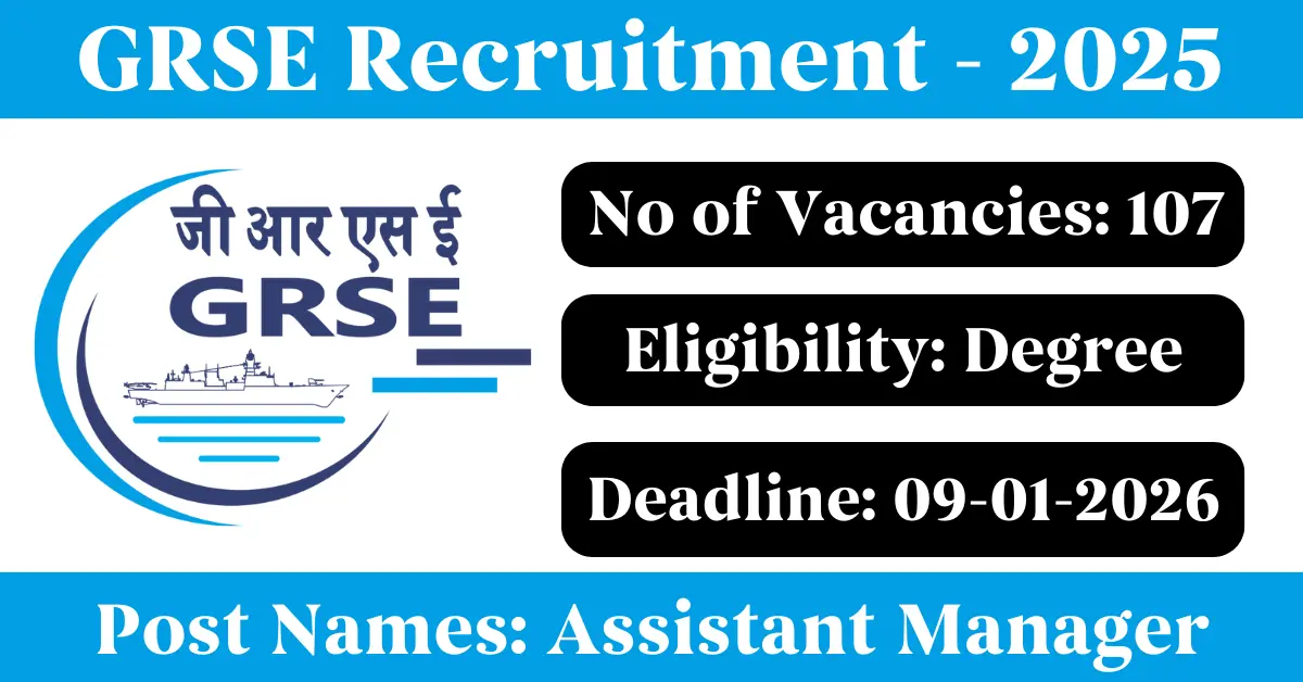GRSE Recruitment 2025: Apply for 107 Manager vacancies. Garden Reach Shipbuilders & Engineers invited applications from eligible and interested candidates to fill up Manager Posts through GRSE official notification December 2025. Job seekers who are looking for a career in Delhi – New Delhi, Visakhapatnam – Andhra Pradesh, Ranchi – Jharkhand, Kolkata – West Bengal Government can make use of this opportunity. Interested candidates can Apply Online/Offline on or before 09-Jan-2026
