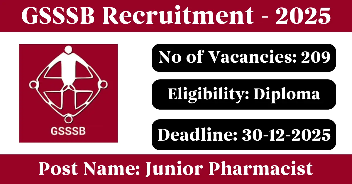 GSSSB Recruitment 2025: Apply for 209 Junior Pharmacist vacancies. Gujarat Secondary Service Selection Board invited applications from eligible and interested candidates to fill up Junior Pharmacist Posts through GSSSB official notification December 2025. Job seekers who are looking for a career in Gujarat Government can make use of this opportunity. Interested candidates can Apply Online on or before 30-Dec-2025