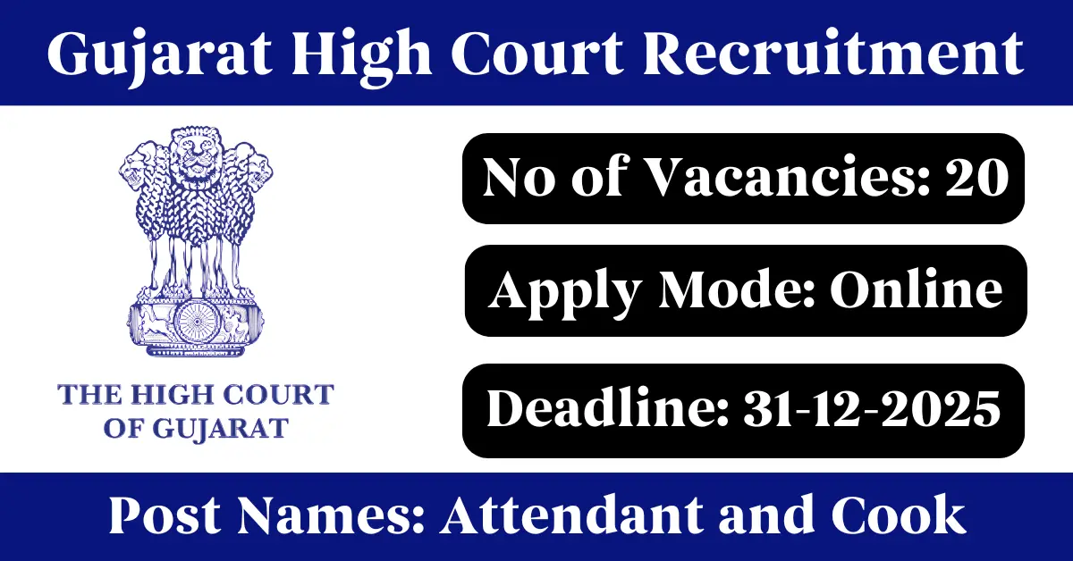Gujarat High Court Recruitment 2025: Apply for 20 Attendant and Cook vacancies. High Court of Gujarat invited applications from eligible and interested candidates to fill up Attendant and Cook Posts through Gujarat High Court official notification December 2025. Job seekers who are looking for a career in Gujarat Government can make use of this opportunity. Interested candidates can Apply Online on or before 31-Dec-2025