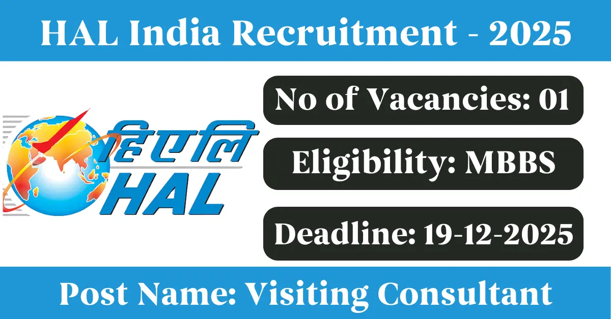 HAL India Recruitment 2025: Apply for 1 Visiting Consultant vacancies. Hindustan Aeronautics Limited invited applications from eligible and interested candidates to fill up Visiting Consultant Posts through HAL India official notification December 2025. Job seekers who are looking for a career in Bengaluru – Karnataka Government can make use of this opportunity. Interested candidates can Apply Offline on or before 19-Dec-2025