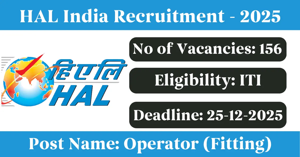 HAL India Recruitment 2025: Apply for 156 Operator vacancies. Hindustan Aeronautics Limited invited applications from eligible and interested candidates to fill up Operator Posts through HAL India official notification December 2025. Job seekers who are looking for a career in Amethi, Lucknow – Uttar Pradesh Government can make use of this opportunity. Interested candidates can Apply Online on or before 25-Dec-2025