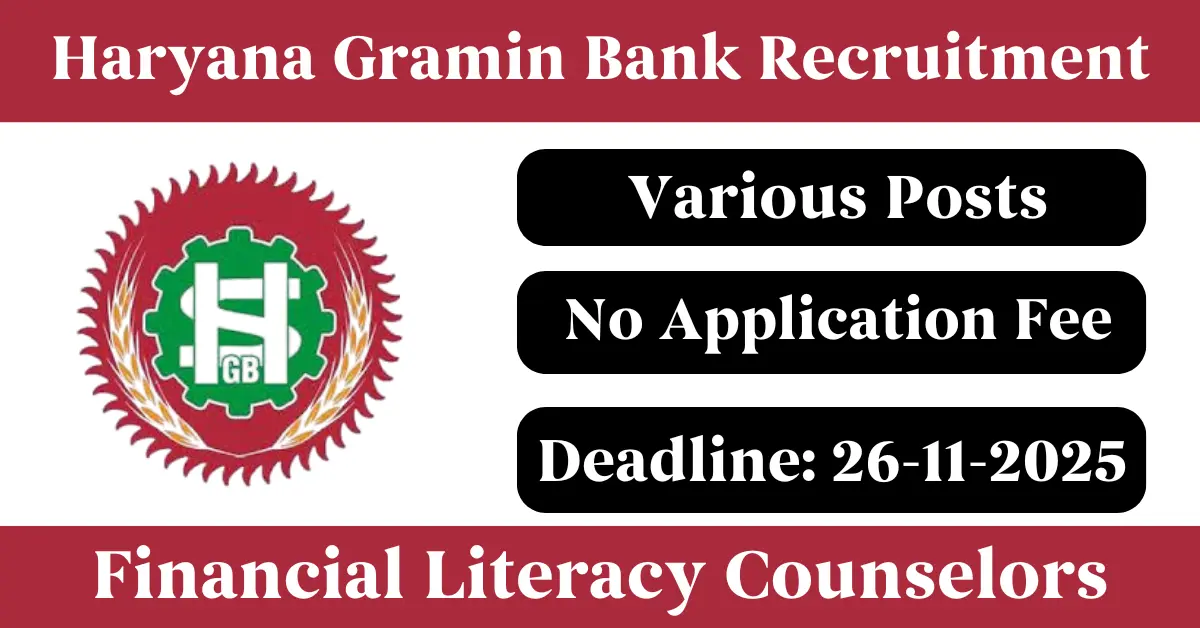 Haryana Gramin Bank Recruitment 2025: Apply for Various Financial Literacy Counselors vacancies. Haryana Gramin Bank invited applications from eligible and interested candidates to fill up Financial Literacy Counselors Posts through Haryana Gramin Bank official notification November 2025. Job seekers who are looking for a career in Haryana Government can make use of this opportunity. Interested candidates can Apply Offline on or before 26-Nov-2025