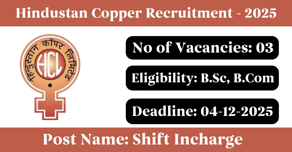 Hindustan Copper Recruitment 2025: Apply for 3 Shift Incharge vacancies. Hindustan Copper Limited invited applications from eligible and interested candidates to fill up Shift Incharge Posts through Hindustan Copper official notification November 2025. Job seekers who are looking for a career in Mumbai – Maharashtra Government can make use of this opportunity. Interested candidates can attend for Walk-in-interview on 04-Dec-2025