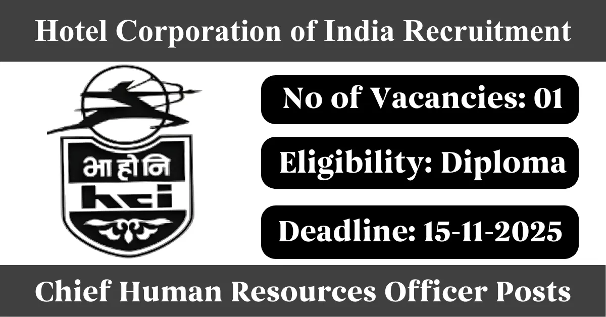 Hotel Corporation of India Recruitment 2025: Apply for 1 Chief Human Resources Officer vacancies. Hotel Corporation of India Limited invited applications from eligible and interested candidates to fill up Chief Human Resources Officer Posts through Hotel Corporation of India official notification November 2025. Job seekers who are looking for a career in Delhi – New Delhi Government can make use of this opportunity. Interested candidates can Apply Offline on or before 15-Nov-2025