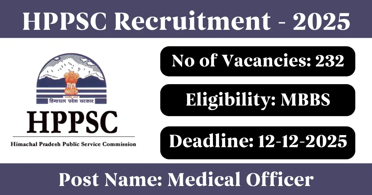 HPPSC Recruitment 2025: Apply for 232 Medical Officer vacancies. Himachal Pradesh Public Service Commission invited applications from eligible and interested candidates to fill up Medical Officer Posts through HPPSC official notification November 2025. Job seekers who are looking for a career in Himachal Pradesh Government can make use of this opportunity. Interested candidates can Apply Online on or before 12-Dec-2025